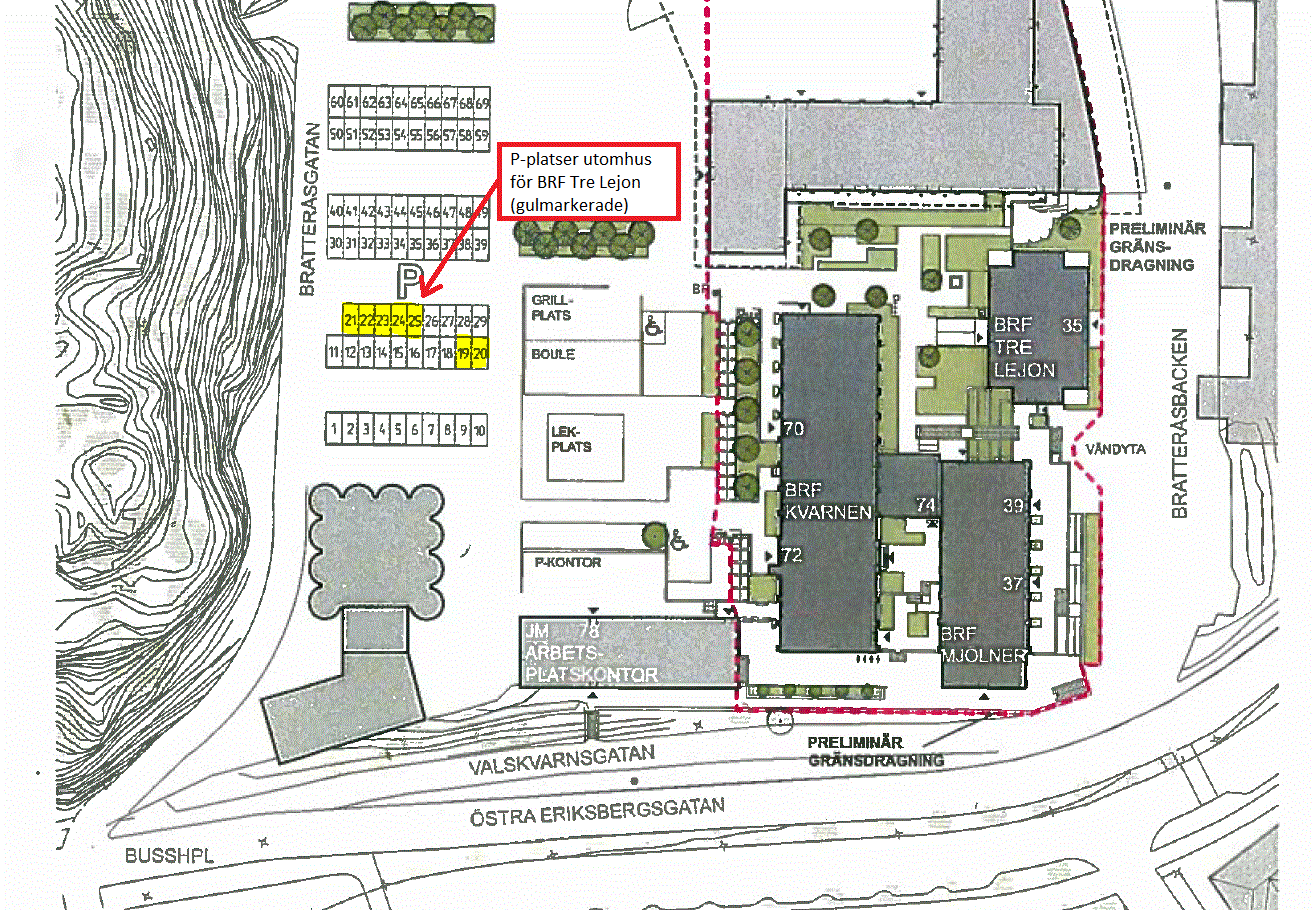 Även för de som tills vidare står kvar utomhus gäller nya parkeringsplatser. Information om nya platser meddelas under vecka 9. Området där våra nuvarande utomhusplatser är belägna kommer stängas av under mars månad. Kartan nedan visar placeringen av våra nya utomhusplatser.